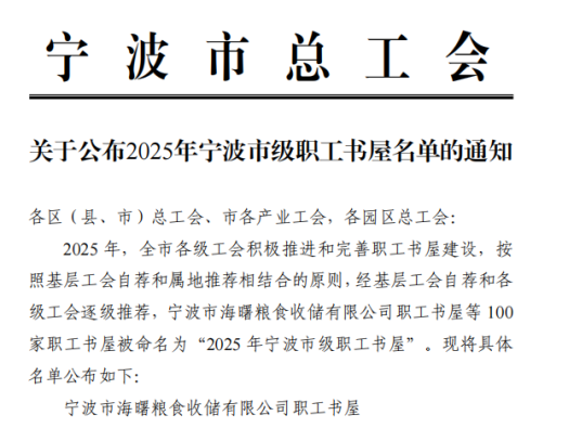近日,海曙粮食收储有限公司在全市总工会“职工书屋”评选中脱颖而出,荣获“2025年宁波市级职工书屋”称号,成为全市国有粮食收储企业中唯一获此荣誉的单位。这一荣誉不仅是对粮食企业文化建设的认可,更是粮食系统将传统粮食文化与现代职工家园建设相结合的重要成果。